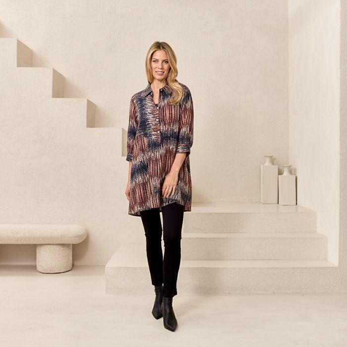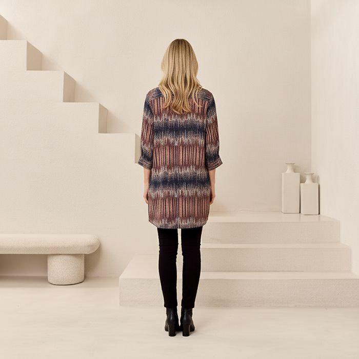 Chic and modern! This top features bold stripes, stylish button details, and a unique hem for effortless elegance.