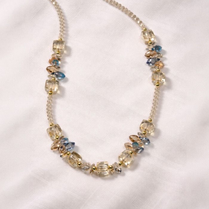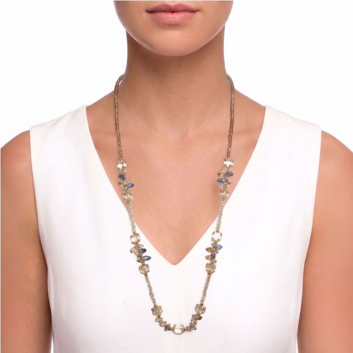 A refined long necklace featuring faceted beads and delicate accent stones, designed to add subtle shimmer and texture. Its versatile silhouette complements both casual and dressy looks, making it an effortless everyday statement piece.