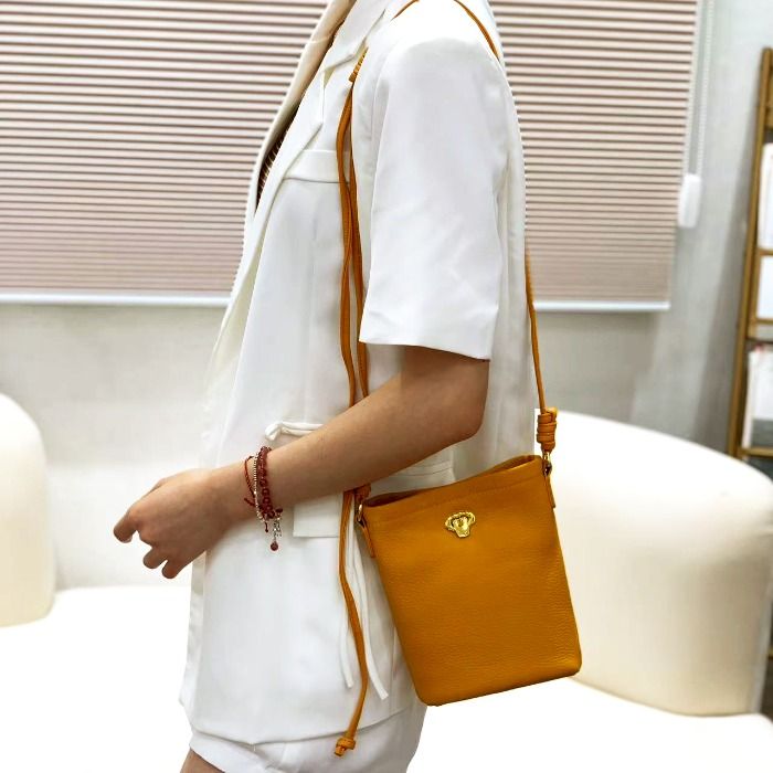 A compact, pebbled genuine leather crossbody featuring a sleek rounded silhouette, adjustable strap, and elegant gold twist-lock closure. Designed to keep your essentials secure and close at hand, it’s the perfect hands-free bag for everyday style and convenience.