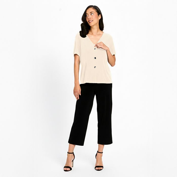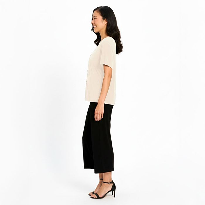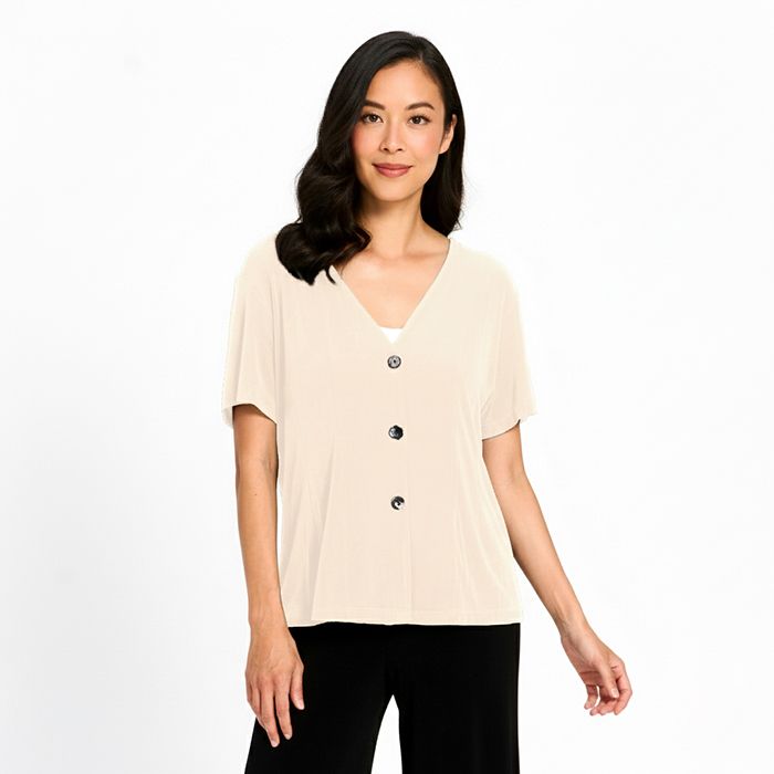 A timeless layering piece, this cardigan features a soft jersey knit with a classic three-button front. Lightweight and versatile, it’s the perfect topper for dresses, blouses, or tanks, adding an effortless touch of polish to any outfit.