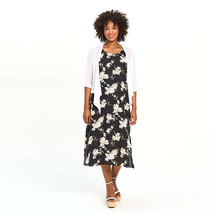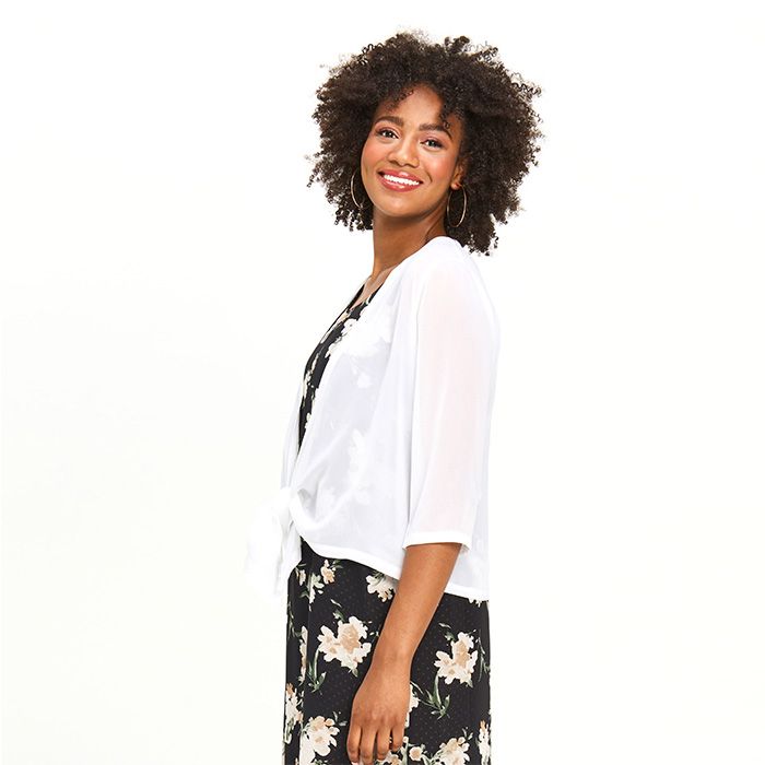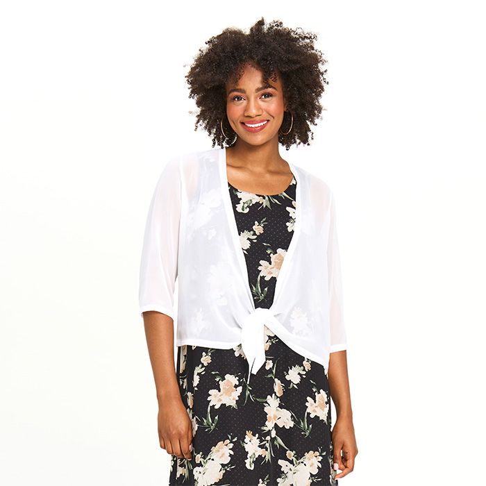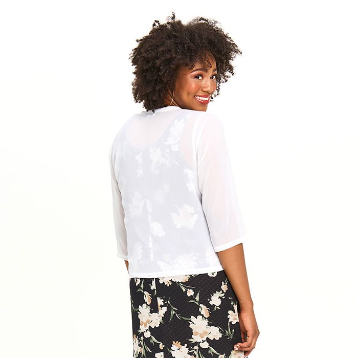 The perfect addition to any elevated look, this drape-style, sheer chiffon bolero features three-quarter sleeves and an easy silhouette.