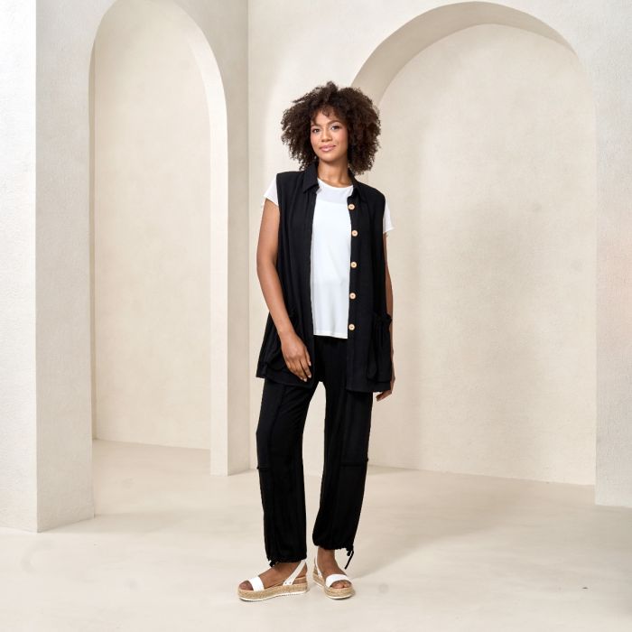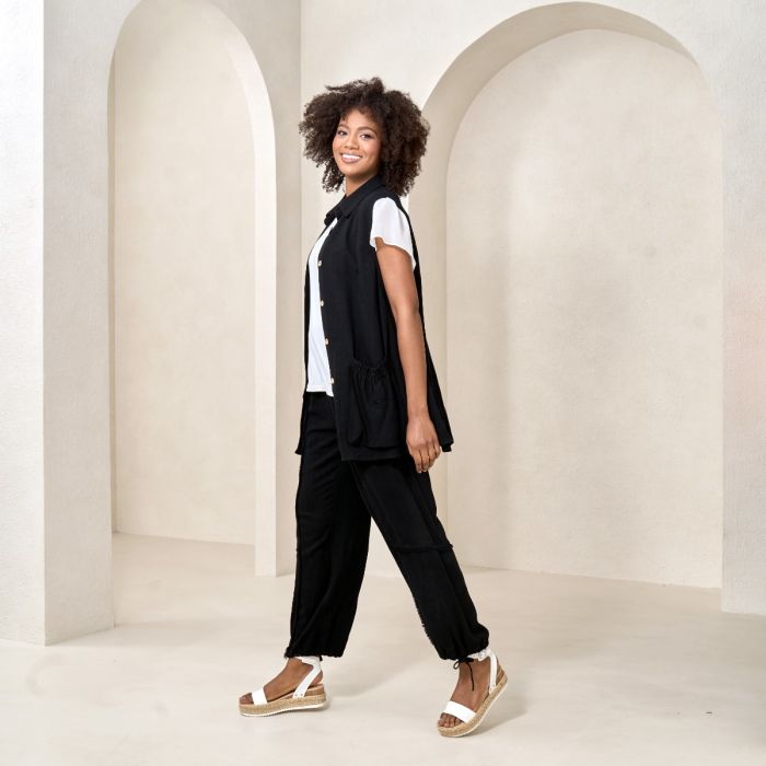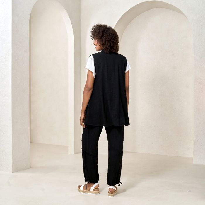 Linen Blend Vest with Pockets in Black