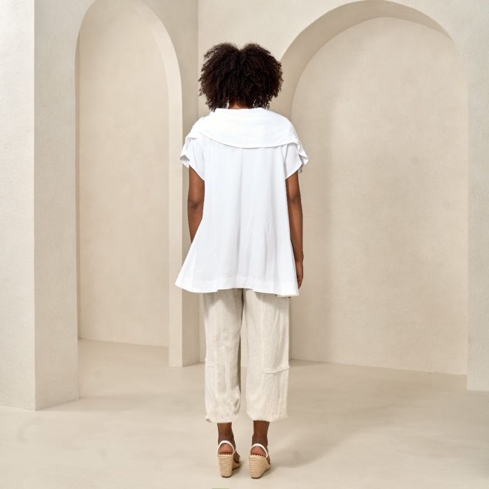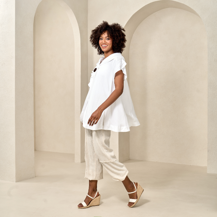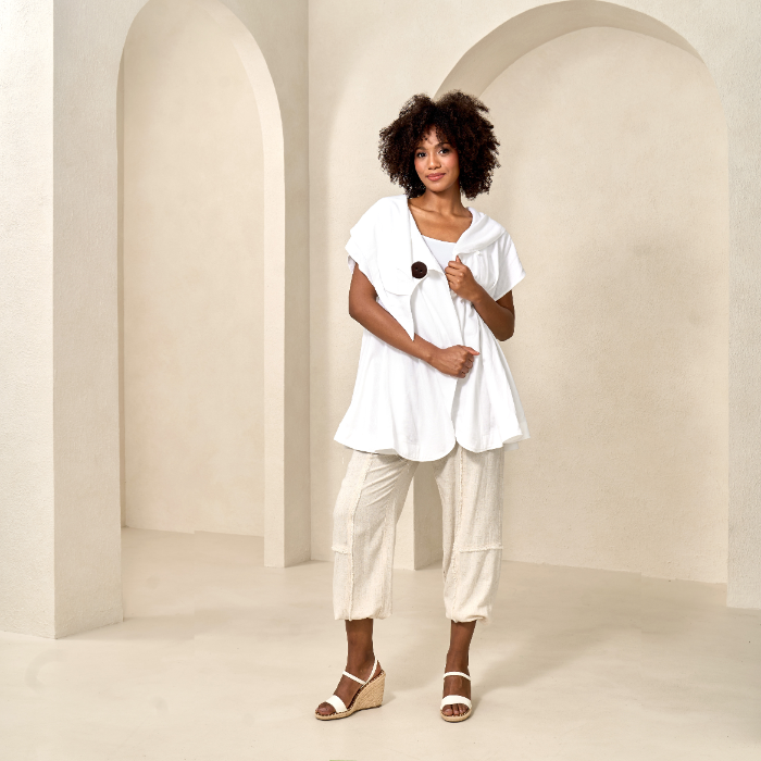 Make a statement with this linen, short sleeve jacket—bold collar and breezy linen for a look that's effortlessly stylish and chic.