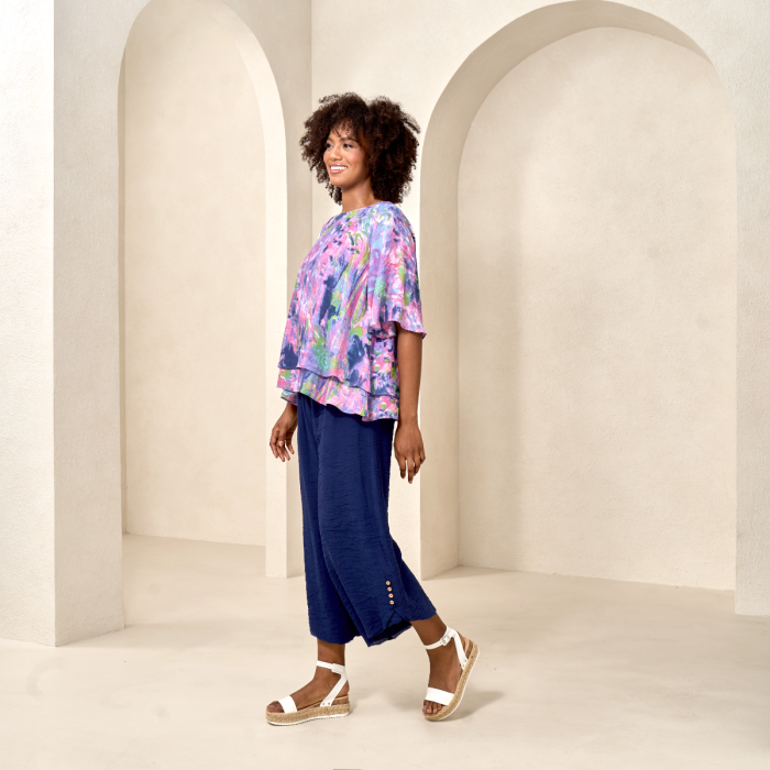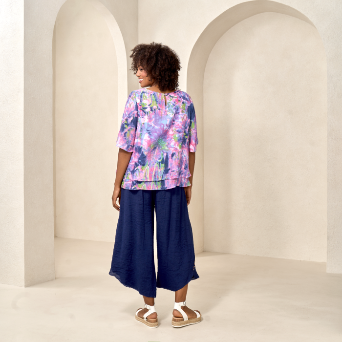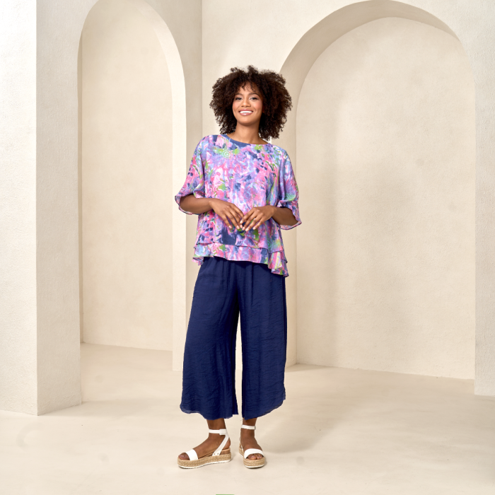 Brighten up your wardrobe with this faux-linen top—vibrant hues and layered elegance for a chic, effortless look.