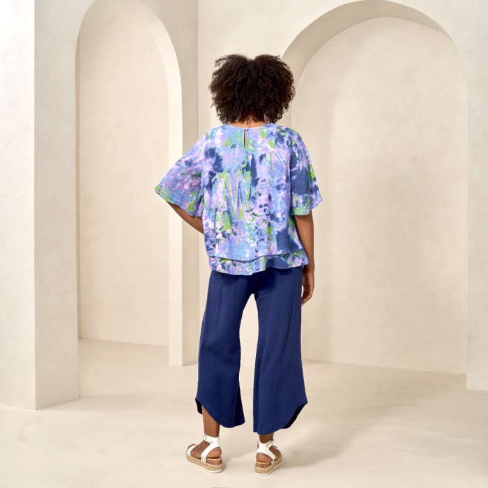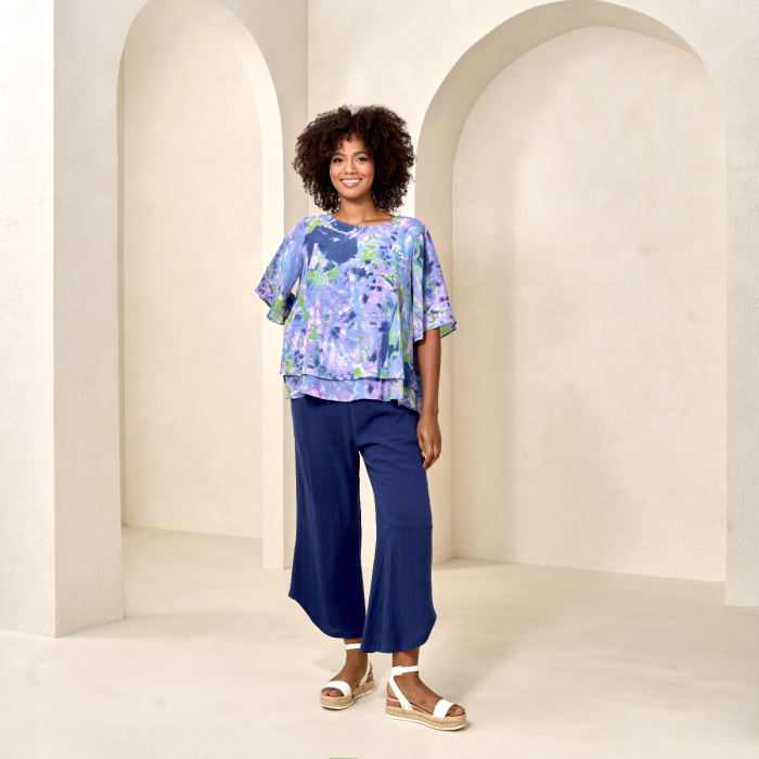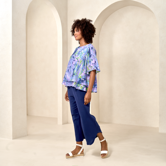 Brighten up your wardrobe with this faux-linen top—vibrant hues and layered elegance for a chic, effortless look.