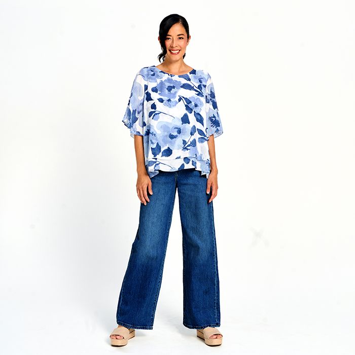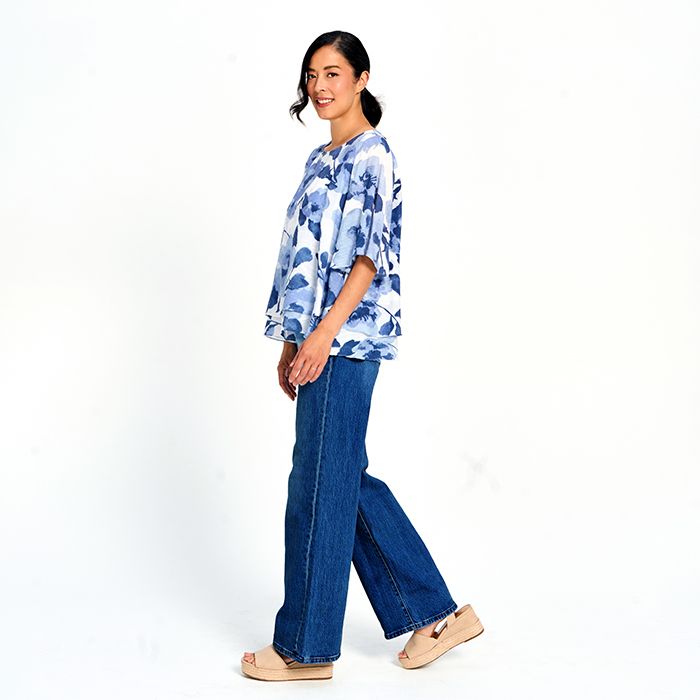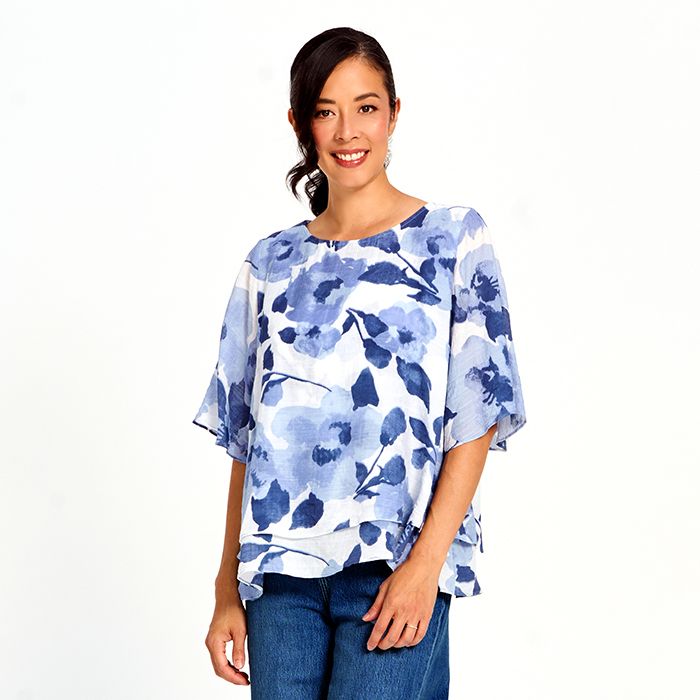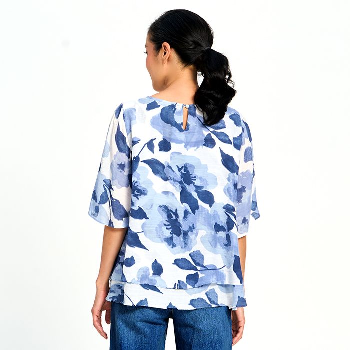 Romantic and airy, this faux linen top blooms with painted florals and a graceful double-layer design. Light and flowing, it flatters with feminine charm, making it an easy choice for both everyday elegance and special moments.