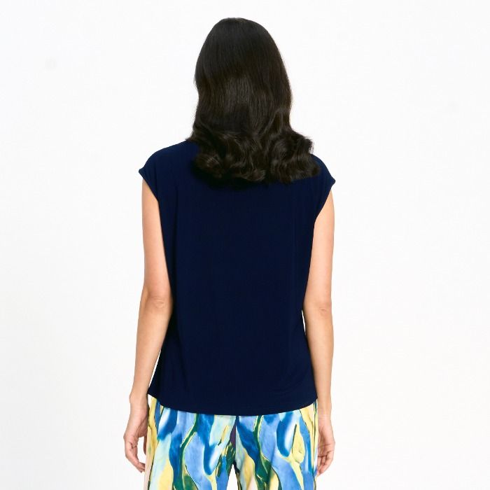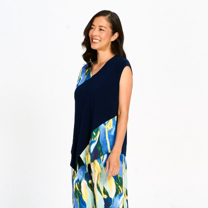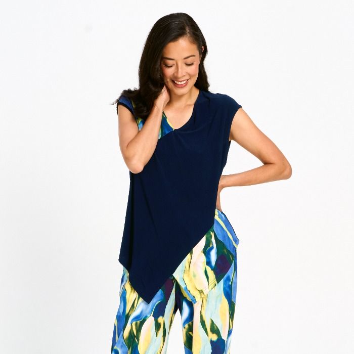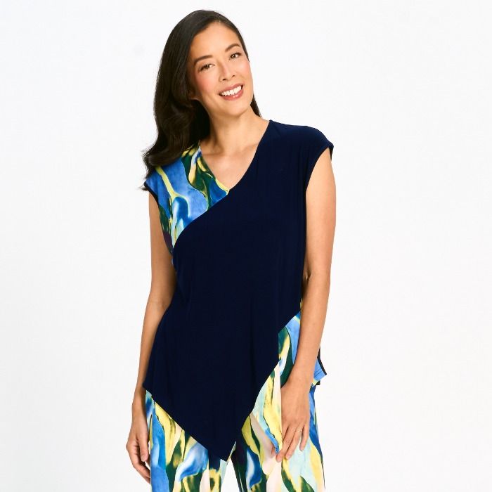 A chic printed top with cap sleeves and a flowing asymmetrical hem, perfect for effortless everyday style.