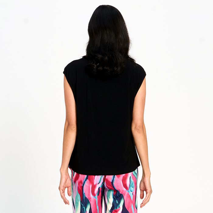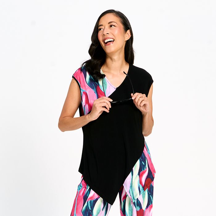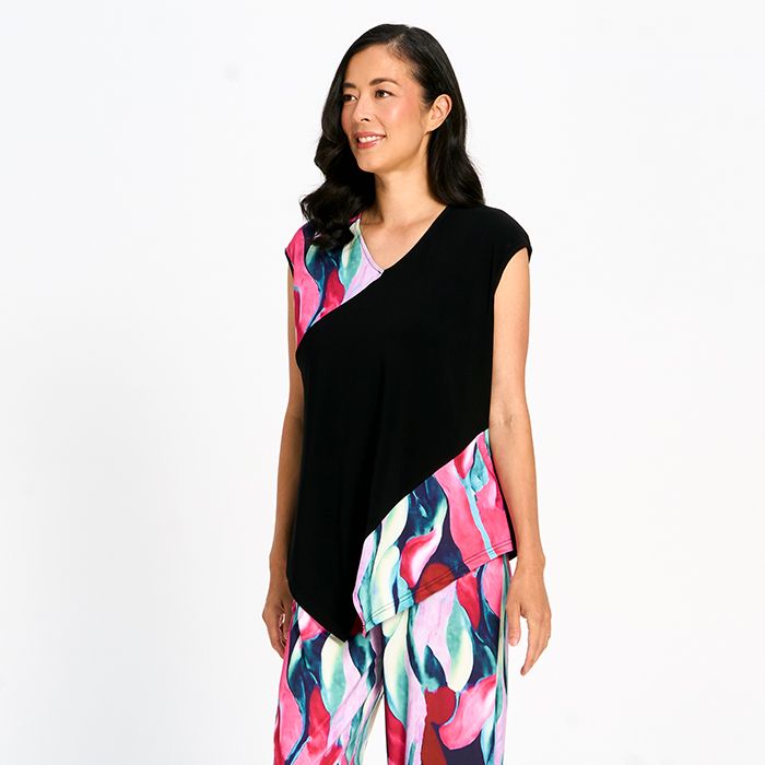 A chic printed top with cap sleeves and a flowing asymmetrical hem, perfect for effortless everyday style.