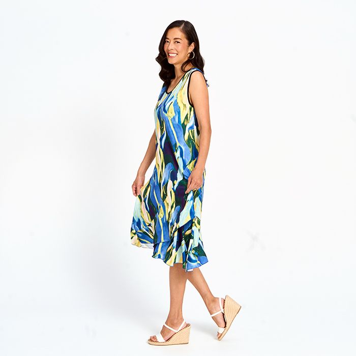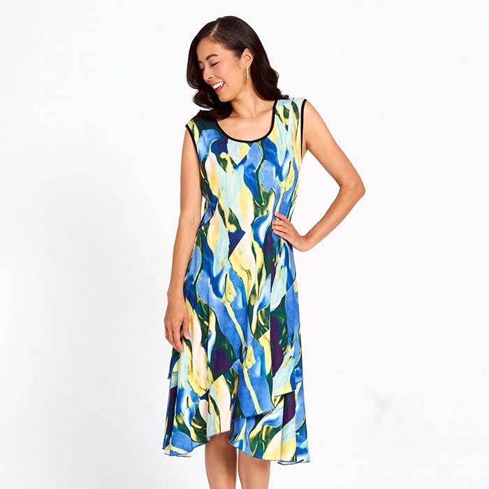 Elegant and easy, this printed layered midi dress offers movement and charm in every step. Lightweight layers create a flattering silhouette, making it perfect for day-to-night wear.