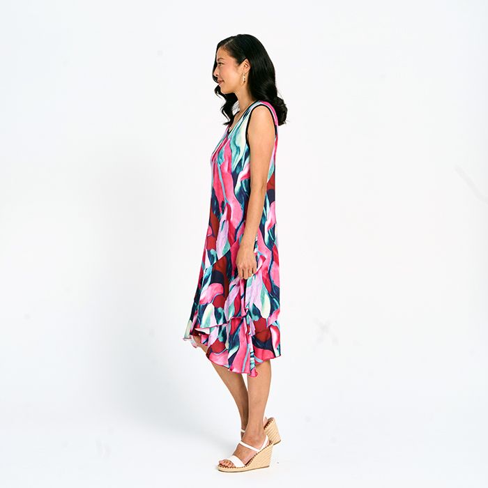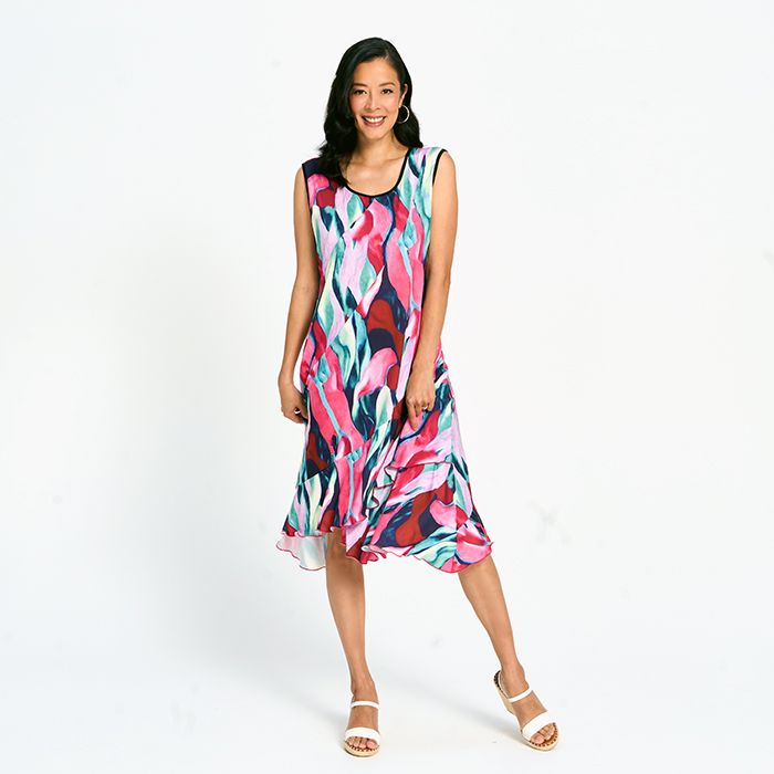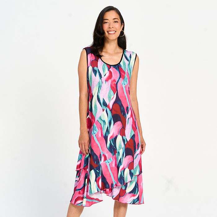 Elegant and easy, this printed layered midi dress offers movement and charm in every step. Lightweight layers create a flattering silhouette, making it perfect for day-to-night wear.