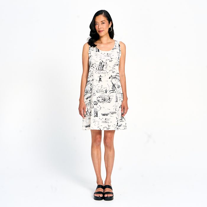 A timeless wardrobe essential, this sleeveless dress features a subtle black-and-white print and practical side pockets. Its clean, relaxed silhouette offers effortless style for any occasion.