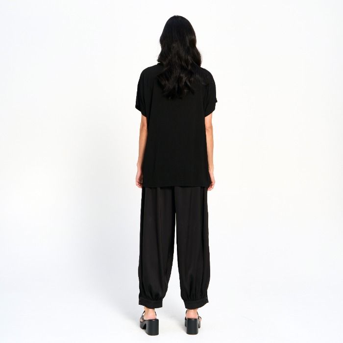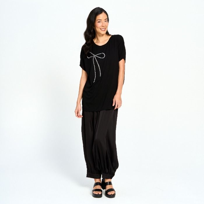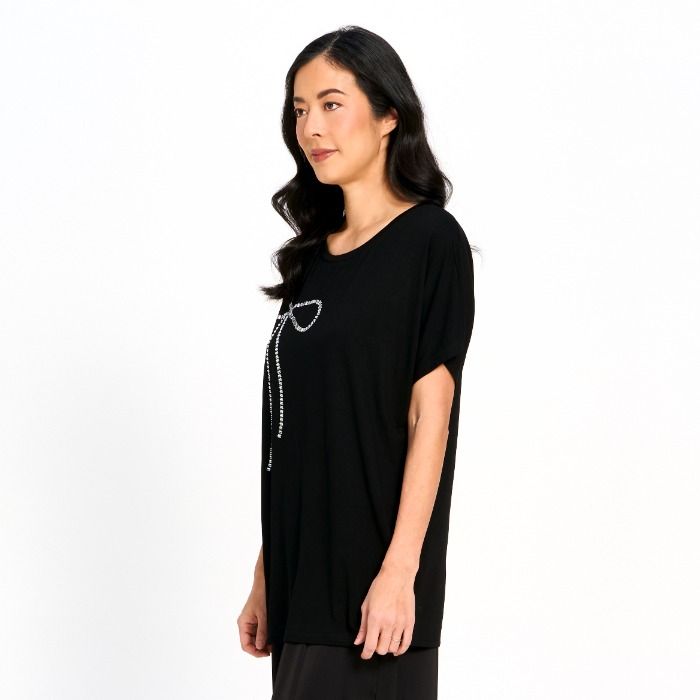 A chic black top finished with a statement rhinestone ribbon detail for just the right touch of sparkle. Designed in a relaxed, easy silhouette, it’s an effortless piece that adds polish to any look — day or night.