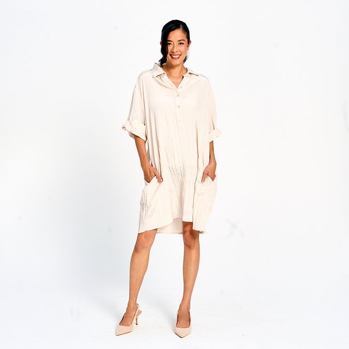 Effortlessly chic and ultra-comfortable, this soft-touch crinkle dress boasts an airy texture, a relaxed silhouette, and convenient side pockets—making it perfect for everyday wear.