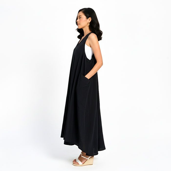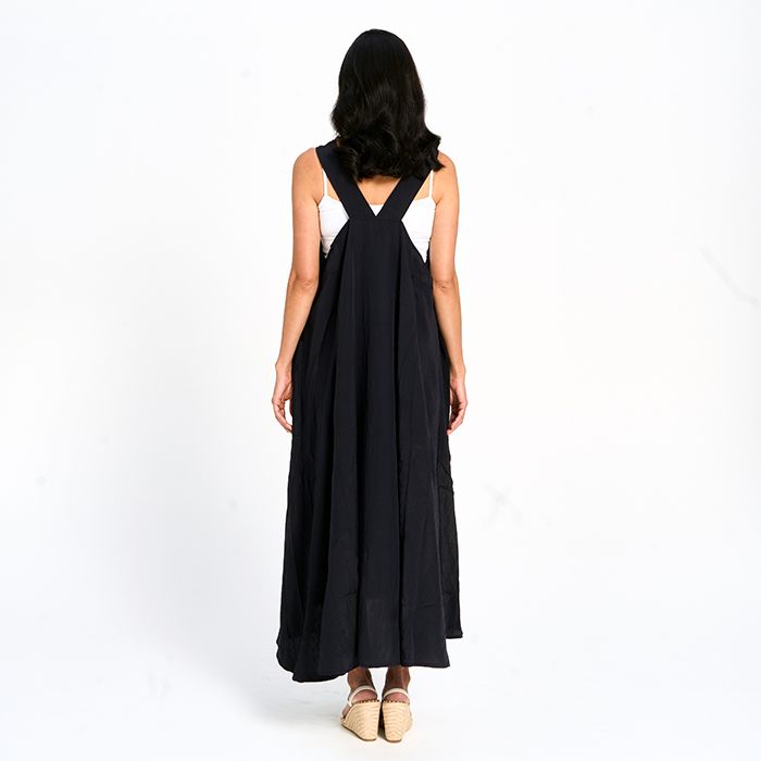 Crafted from soft-touch crinkle fabric, this sleeveless dress combines effortless comfort with modern style. The X-back design adds a chic twist, while the spacious pockets bring both function and ease. Perfect for warm days, it’s a versatile piece you can dress up or down.
