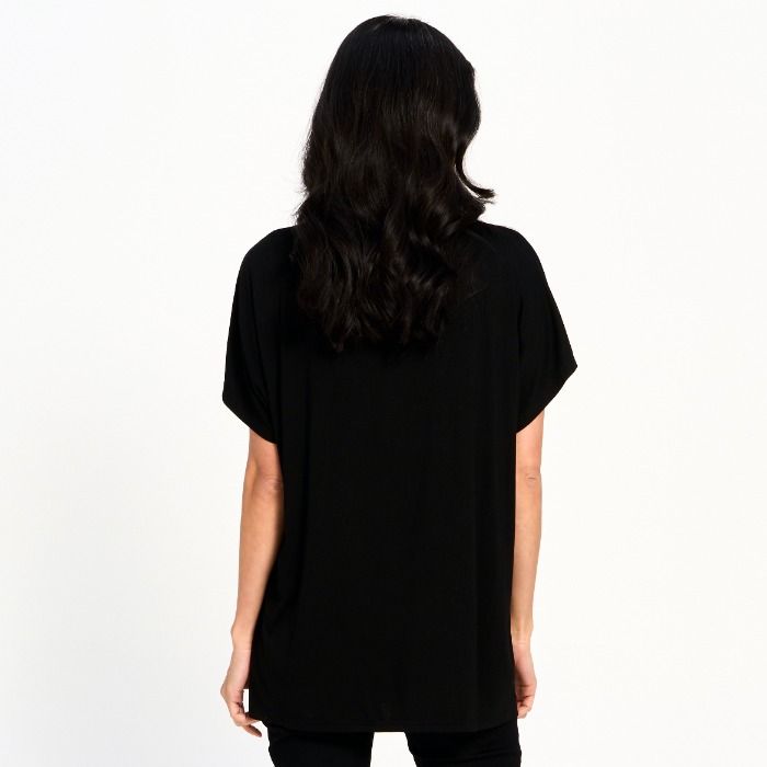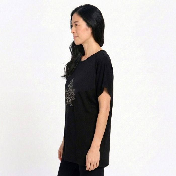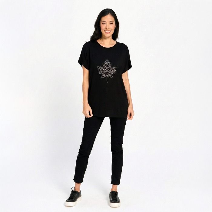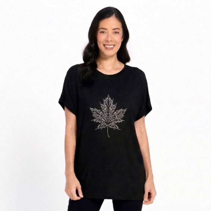 A classic black top featuring a shimmering maple leaf design for a subtle statement. With its relaxed fit and effortless drape, it’s a comfortable yet polished piece perfect for everyday wear with a touch of Canadian charm.