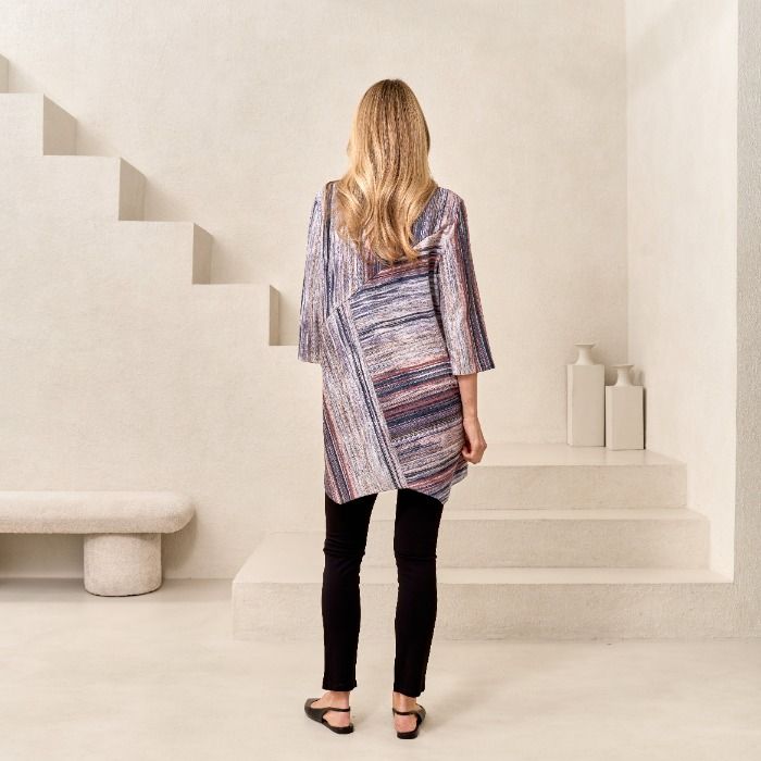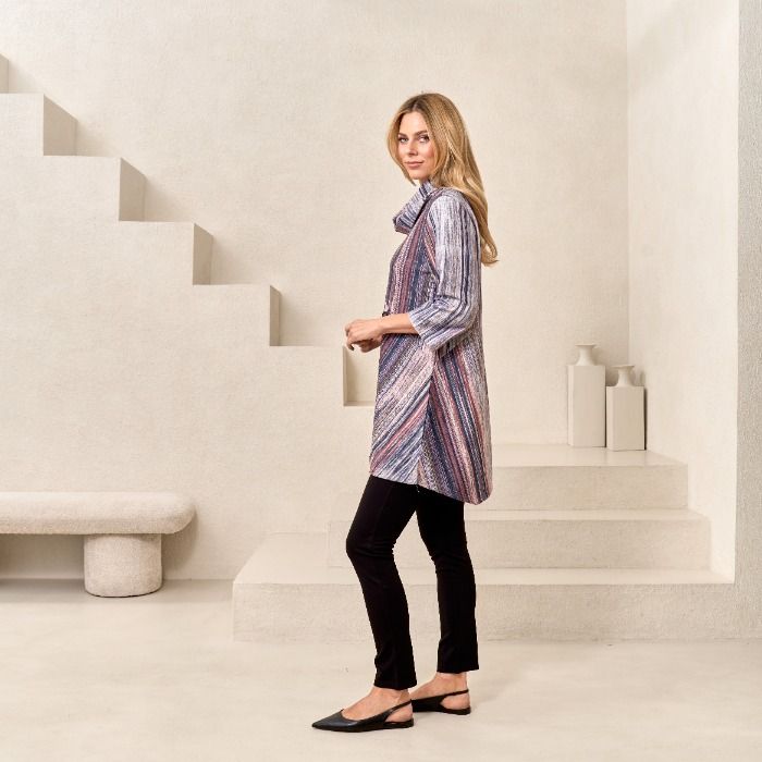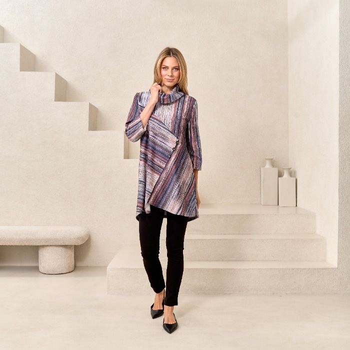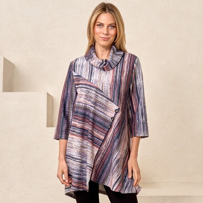 Stand out in style with this tunic top—a chic blend of bold stripes, unique angles, and eye-catching button accents!