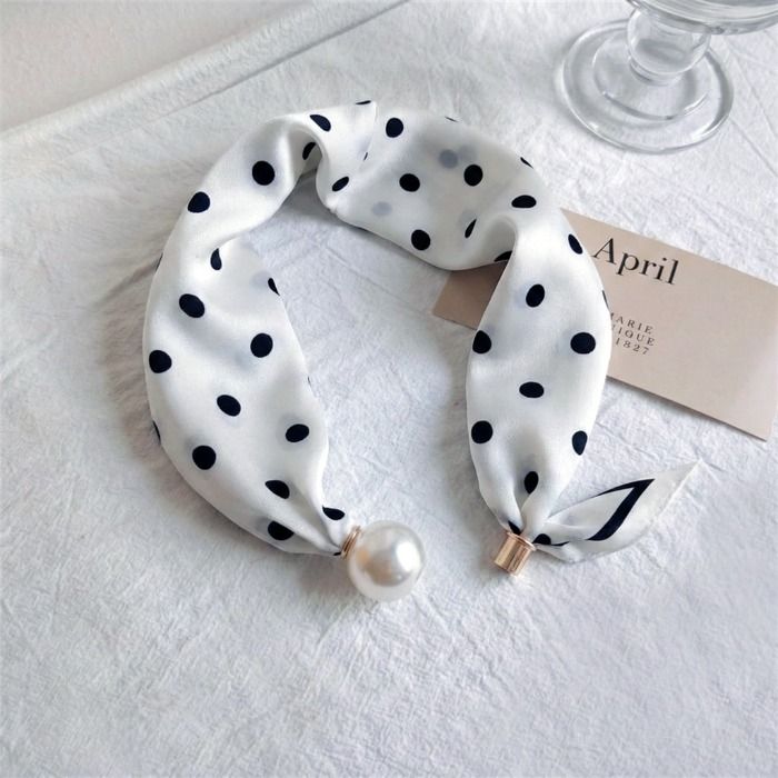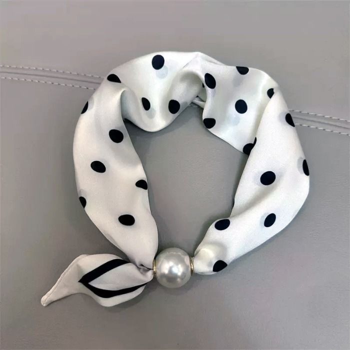 A timeless white scarf accented with crisp black polka dots for effortless elegance. Finished with a lustrous pearl detail, this scarf adds a refined touch to both casual and dressy looks. Lightweight and silky, it’s designed to sit neatly around the neck, making it perfect for everyday wear or polished occasions.